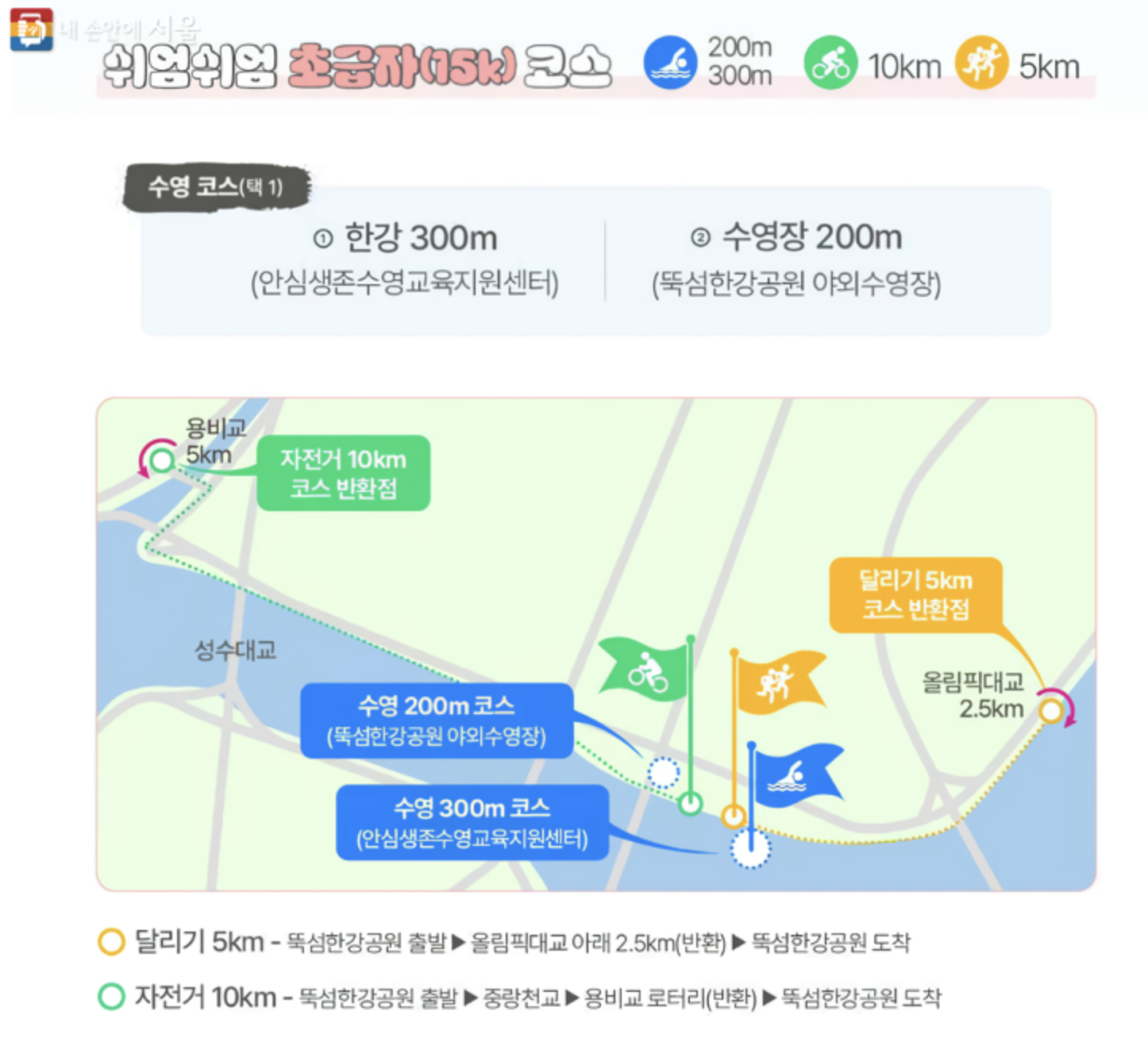 | 상급자 코스 | 수영(한강) 1km + 자전거 20km + 달리기 10km | 6월 1일 | 9시, 13시, 16시 |